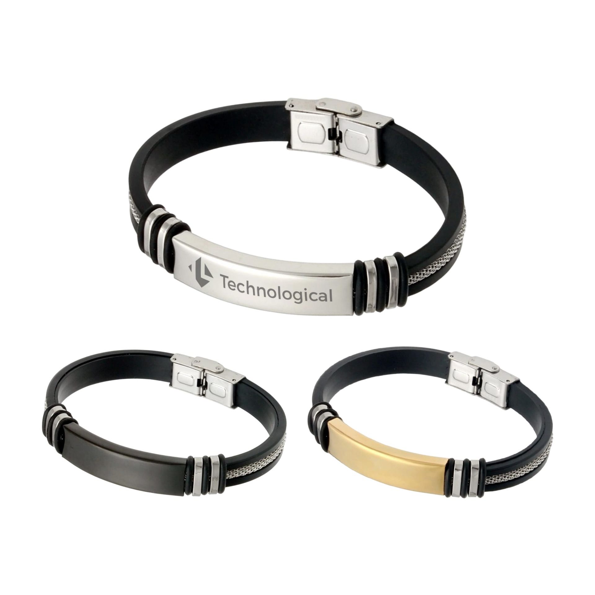 Elevate your brand presence with our Buckle Latch Silica Silver Bracelet, featuring a classic hook buckle for reliable daily wear. Crafted from silicone rubber and metal, our bracelet combines a black strap, a silver core, and a metal arc in silver, black, or gold. Custom logos or brand messages through engraving on the metal arc can enhance the effect of brand promotions. Perfect for sports events, team activities, or promotional campaigns, our bracelet offers both modern functionality and effective brand visibility.