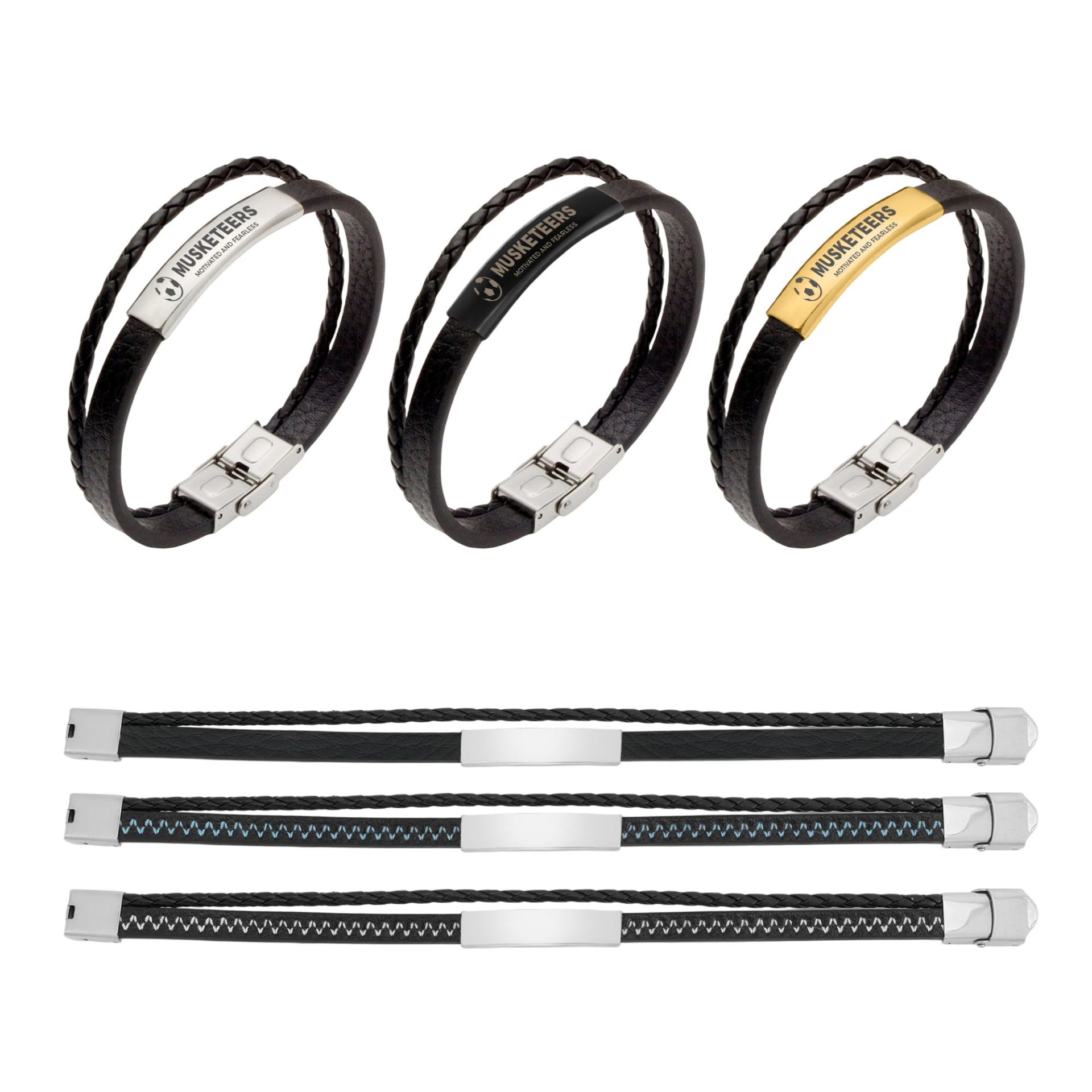 Enhance your branding with our Custom Leather Bracelet, featuring two stylish PU leather straps and a hook buckle. Crafted from soft PU leather and durable metal, our bracelet offers a black strap paired with a metal arc in silver, black, or gold. Showcase brand identity through engraving that keeps your logos or brand messages clearly visible. Perfect for fashion events, team gatherings, or corporate promotions, our double-layer bracelet provides a modern and fashionable way to showcase your brand.