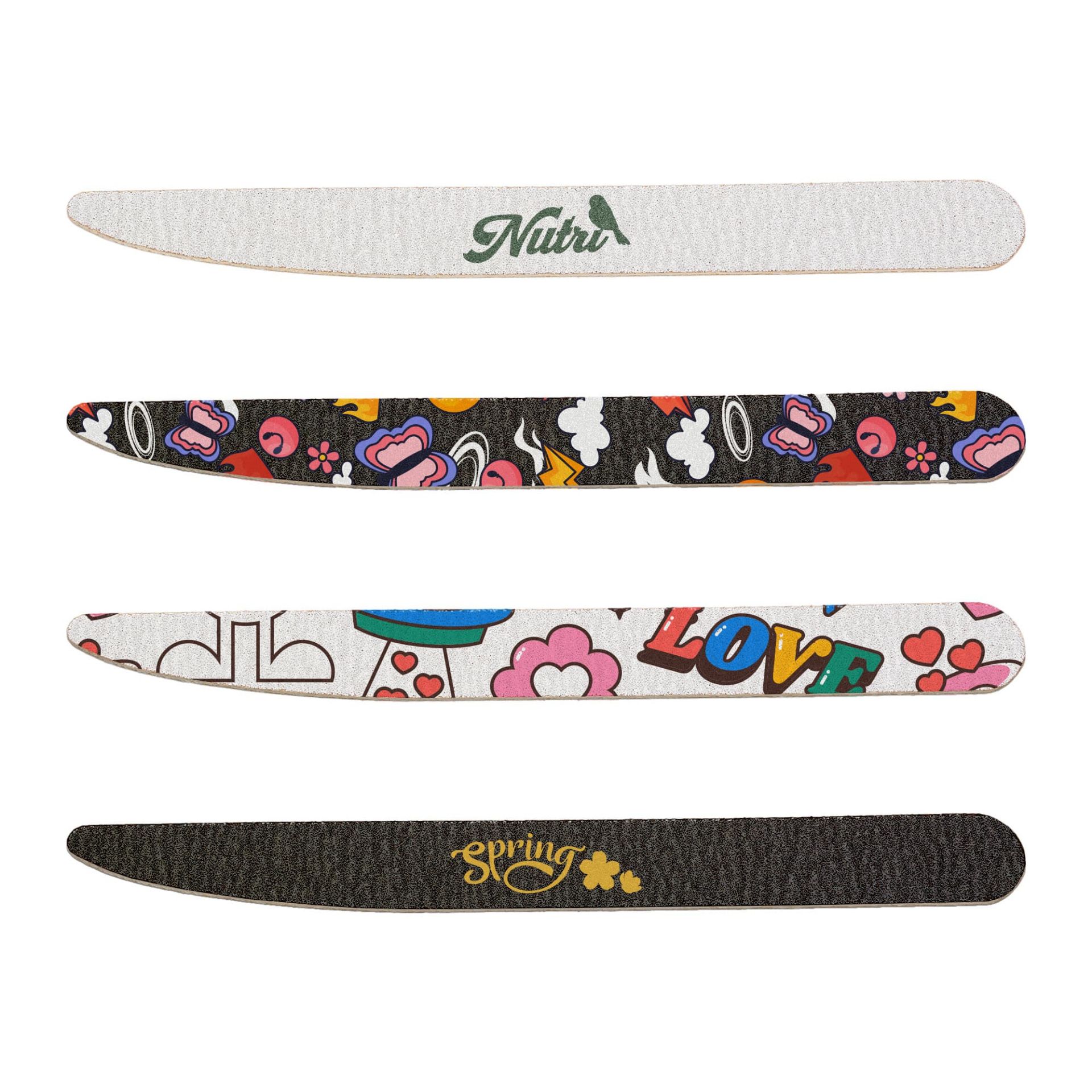 Care for your nails with our Pack of 50 Wooden Knife Shape Nail Files, crafted from wood and sandpaper. Featuring a curved blade shape with 100 grit on one side and 180 grit on the other. With Digital UV printing or Pad printing to showcase your logos or brand messages. Perfect for salons, nail studios, or bulk promotions, our file provides a practical way to promote your brand.